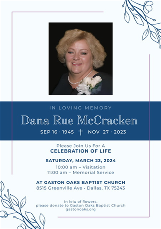 Ms. Dana Rue Mccracken, age 78, passed away on Monday, November 27, 2023, in Dallas, Texas. She will be sincerely missed by her loving family, devoted friends, and all the wonderful individuals who knew and loved her. Read Obituary